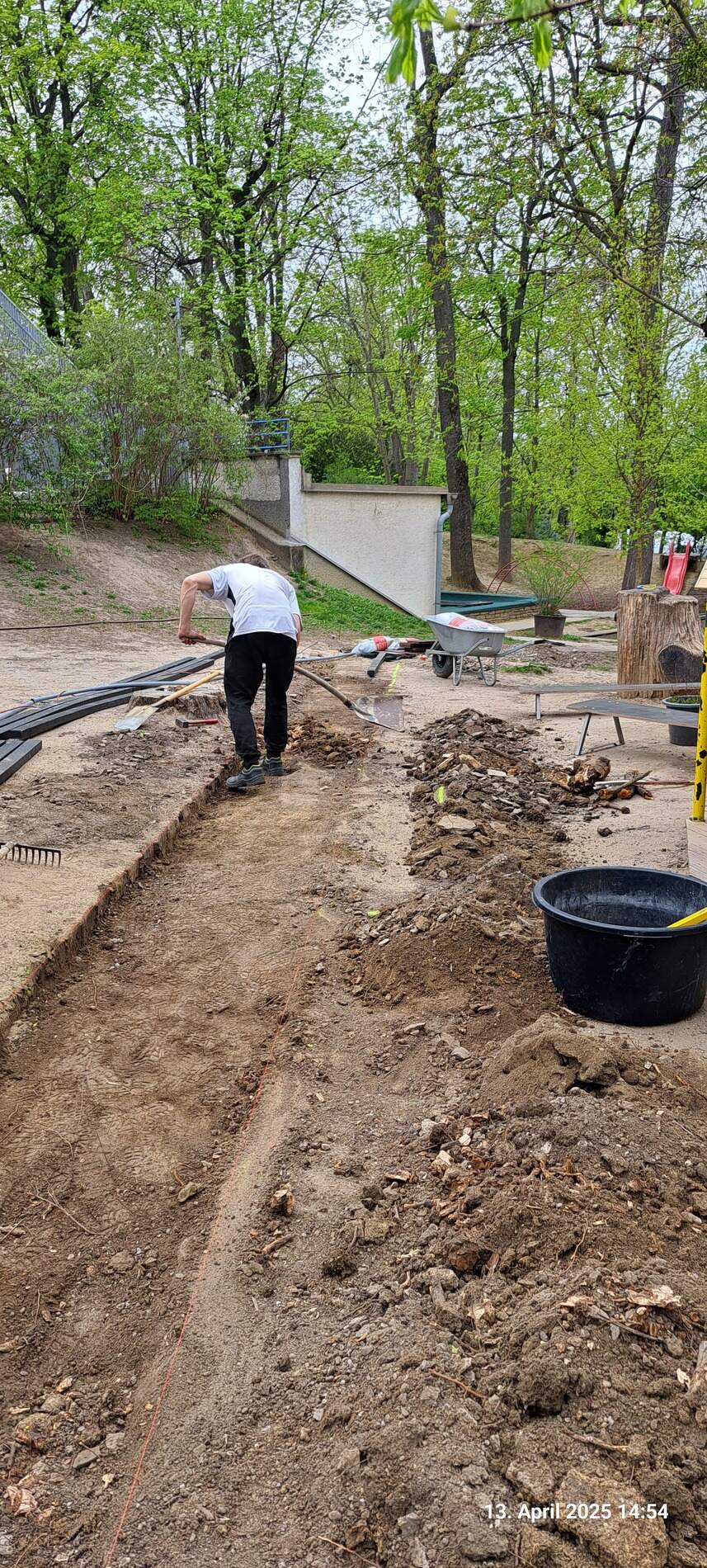 Das neue Zugangstor wird fertig austariert und eingegossen und mit unserem Anlagenzylinder ausgestattet. Nach den Osterfeiertagen kann der neue Zugang bereits genutzt werden. Nach der Wegemarkierung startet nun die Trassierung, in diesem abfallenden Gelände eine anspruchsvolle Tätigkeit für unsere freiwillig mitarbeitenden Vereinsmitglieder und wohl der härteste Arbeitsteil.