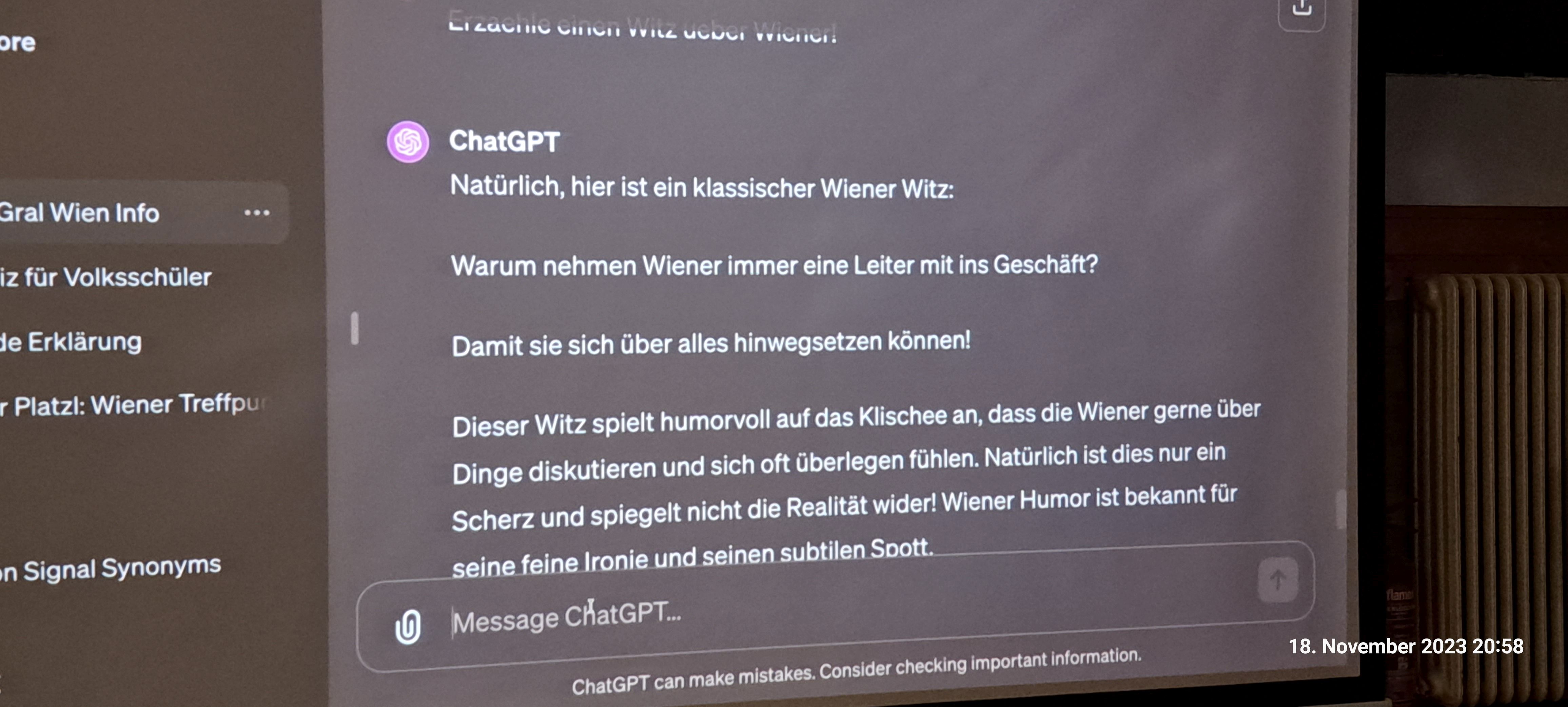 Der Abschuss nach rund 90-minütigem Vortrag und Test war die Frage an ChatGPT: Kennst du einen Witz über Wiener?