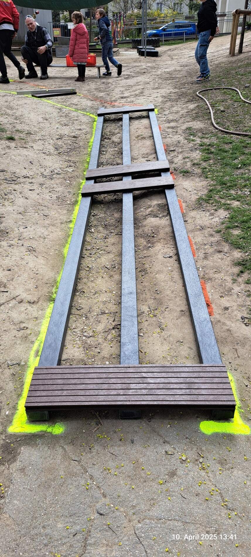 Bodenmarkierungen abgeschlossen, Test der Modulbauweise und Start zum Einbau des neuen Eingangstores
